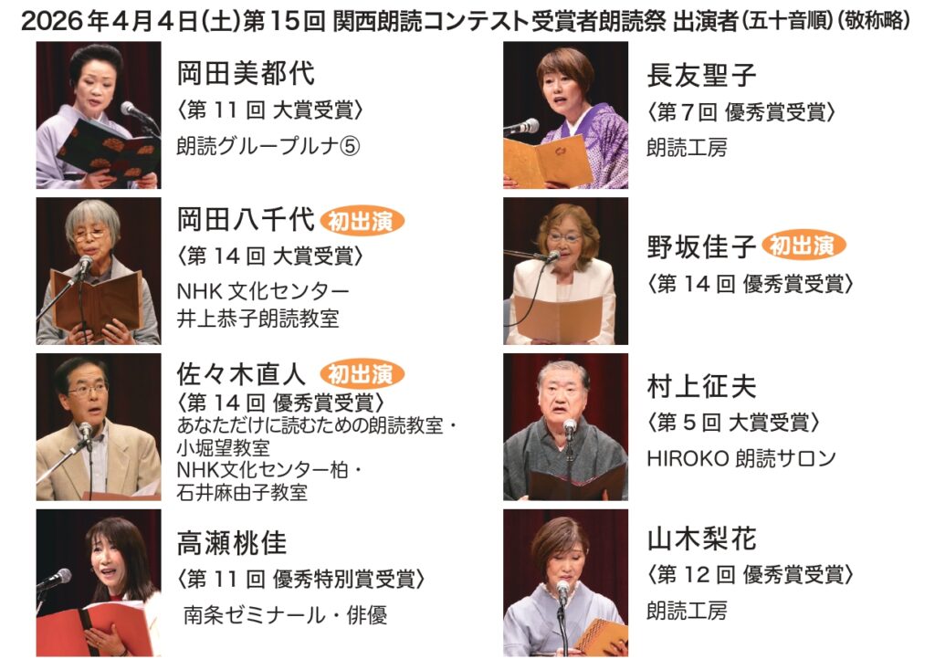 関西朗読コンテストでは、2014年より受賞者の受賞後を応援する「受賞者朗読祭」を開催しています。第15回は2026年4月4日(土)、会場はコミ協ひがしなり区民センター(東成区民センター)2階大ホールです。今回は第14回の大賞・優秀賞受賞者3名が初出演、8人の受賞者が「私がいま、いちばん読みたい作品、気に入っている作品」を語ります。ぜひ受賞後の精進と成熟ぶりをお楽しみください。