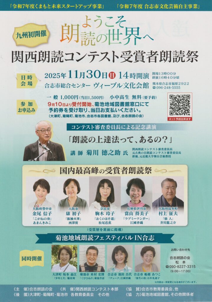 九州熊本県合志市で11月30日(日)に「菊池地域朗読フェスティバルIN合志&関西朗読コンテスト受賞者朗読祭」が開催されます。主催:合志朗読の会(代表:松本武士さん/関西朗読コンテスト第10回優秀賞受賞)、関西朗読コンテスト本部共催。関西朗読コンテスト審査委員長 菊川徳之助先生による記念講演とコンテスト受賞者5名による朗読、併せて合志朗読の会の活動拠点がある菊池地域で朗読を学んでおられる4名が朗読を披露されます。初めて関西を離れての受賞者朗読祭、朗読の世界がたっぷり楽しめる内容になっています。この公演については、次号の季刊誌「関西朗読・語りのひろば」(2026年1月発行)で紹介予定です。