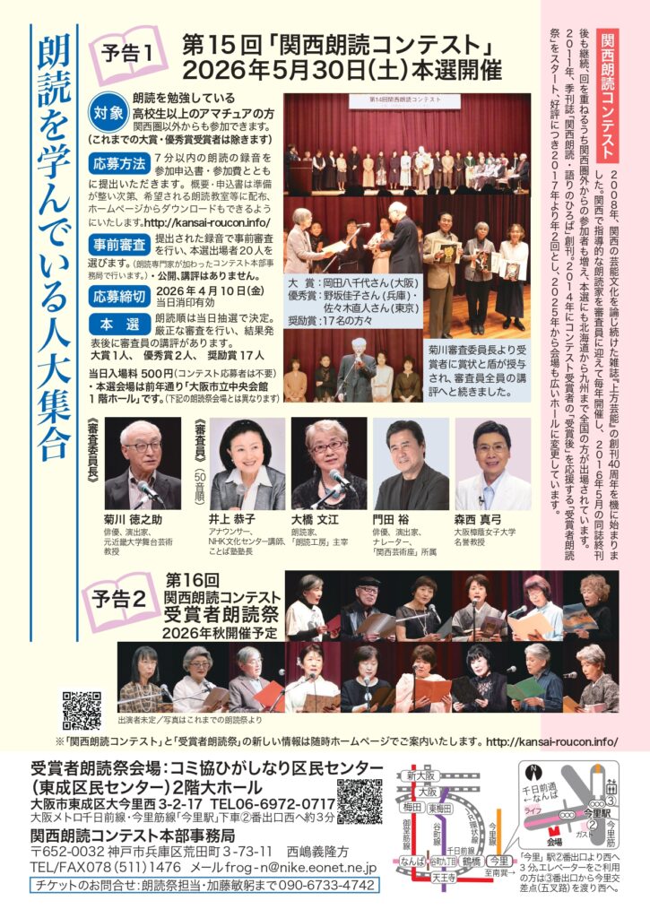 第15回関西朗読コンテスト受賞者朗読祭は2026年4月4日(土)開催です。受賞者朗読祭は第14回から広い会場のコミ協ひがしなり区民センターに変わりましたので座席に余裕があります。朗読を学ばれている方、朗読ファンの皆さま、どうぞお越しください。なお、先にご案内しましたチラシの裏面で「第15回 関西朗読コンテスト 2026年6月頃本選開催予定」としていましたが、その後コンテストは5月30日(土)に決まりました。改訂したチラシを増刷しましたので、新しい内容で再度アップいたします。(関西朗読コンテストと受賞者朗読祭は会場が異なります。お間違えありませんように。)