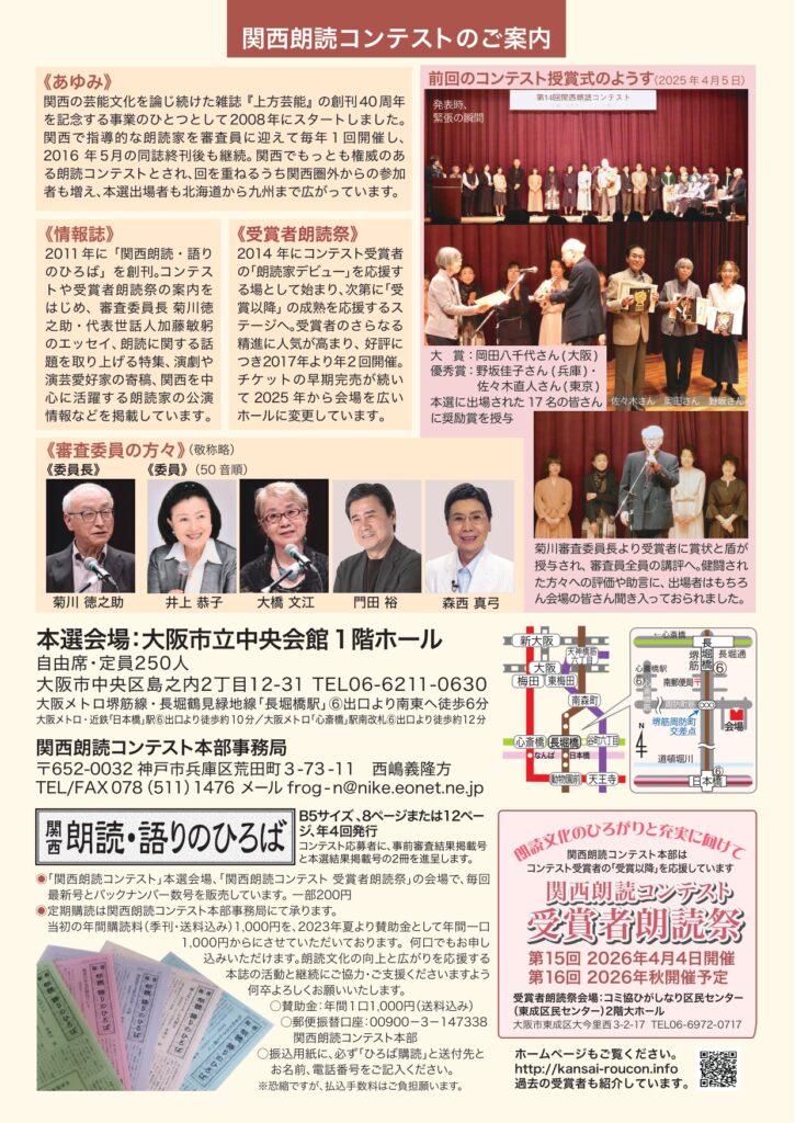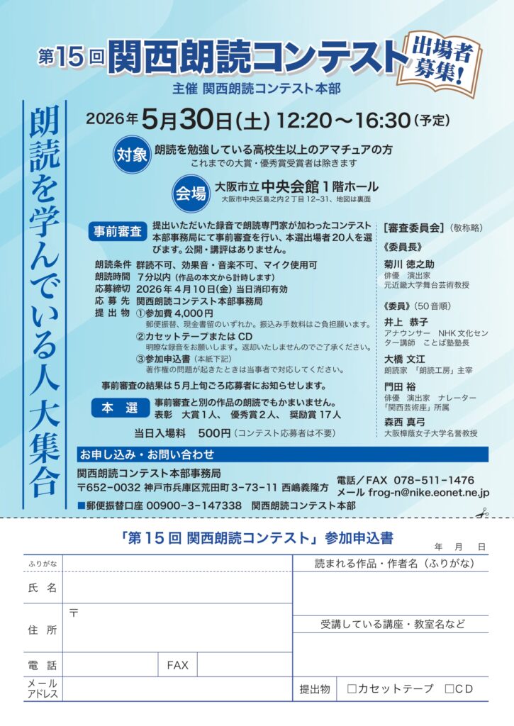 026年「第15回関西朗読コンテスト」の募集を始めました。朗読を学ぶ皆さまのご応募をお待ちしています。朗読の7分以内の録音(カセットテープまたはCD)と参加申込書+参加費を提出いただき、録音で事前審査を行って本選出場者20名を選出、本選を2026年5月30日(土)に大阪市立中央会館にて開催して、大賞1人、優秀賞2人、奨励賞17名を表彰します。当日の入場料500円、コンテストに応募された方は入場料不要です。さらに募特典として、応募者全員に季刊誌「関西朗読・語りのひろば」48号と49号の2冊を進呈します。次号の48号では第一次審査結果をお知らせするため5月初旬に発行予定です。49号は本選の様子や受賞者の声などをご紹介します。応募締め切りは2026年4月10日(金)です。